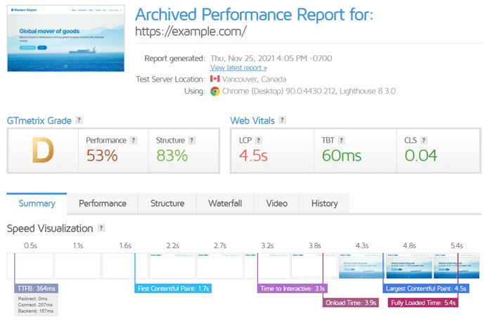 برای استفاده از جی تی متریکس، تنها کاری که باید انجام دهید این است که آدرس وب سایت خود را در کادر جستجوی این سایت وارد کنید. پس از انتظار زمانی کوتاه، جی تی متریکس یک گزارش عملکرد جامع همانند تصویر زیر ارائه می دهد که شامل موارد زیر است: