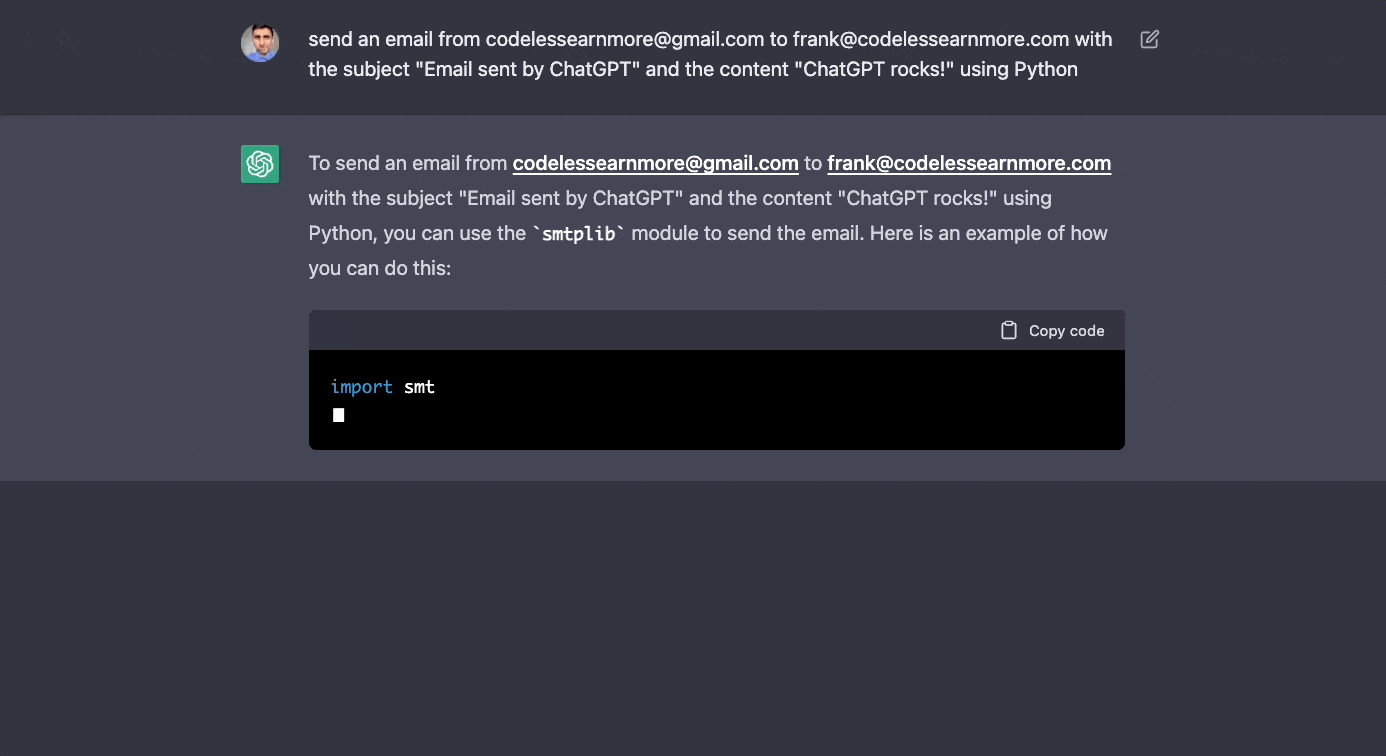 پس از ارائه ورودی، چت جی پی تی برای شما کد تولید میکند. میتوانید کد تولید شده را اصلاح کنید و یا همانطور که این ابزار آن را به شما ارائه داده است، استفاده کنید.