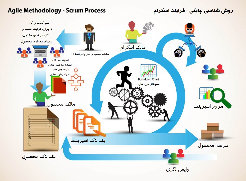 اسکرام در اصل نسخه تکامل یافته مدیریت چابک است. روش شناسی اسکرام مبتنی بر مجموعهای از روشها و نقشهای بسیار مشخص است که باید در فرایند توسعه نرم افزار به کار گرفته شوند. این روش شناسی انعطاف پذیر به کارگیری 12 اصل چابکی در فضای مورد توافق اعضای تیم تولید محصول را مطلوب میداند.