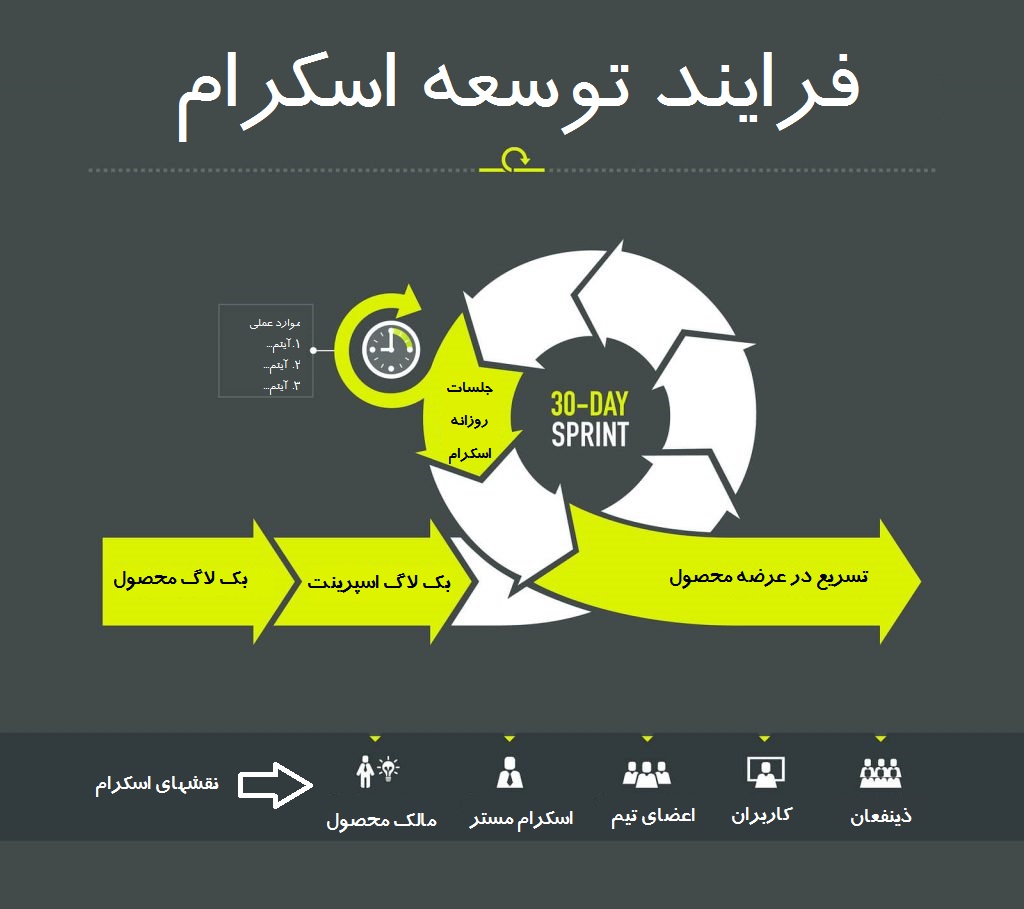 مالک محصول یا (PO) Product owner: نماینده ذینفعان ومشتریان استفاده کننده از نرم افزار است. آنها روی بخش تجاری متمرکز بوده و در قبال ROI پروژه مسئول هستند. آنها چشم انداز پروژه را برای تیم تبیین نموده و مزایای حاصل از لیست ویژگیهای محصول یا Product Backlog را مشخص نموده و آنها را به ترتیب اولویت بندی میکنند.